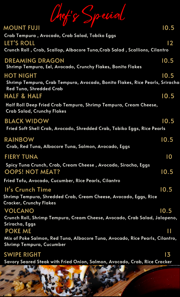 Spicy Tuna crunch, Crab, Cream cheese, Avocado, Sriracha, Eggs Drizzled with eel sauce & spicy Mayo on top