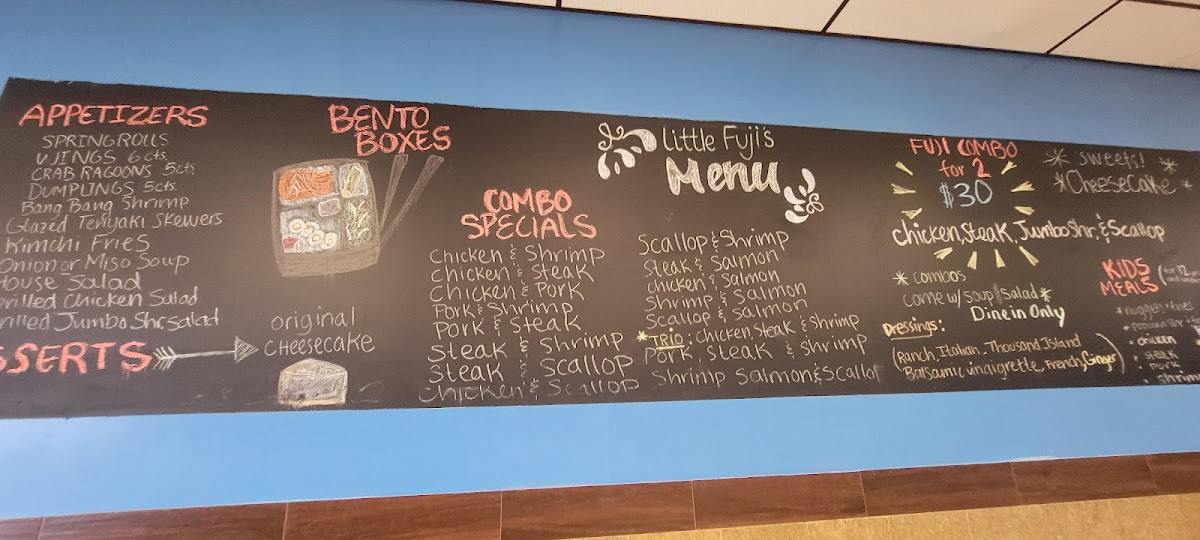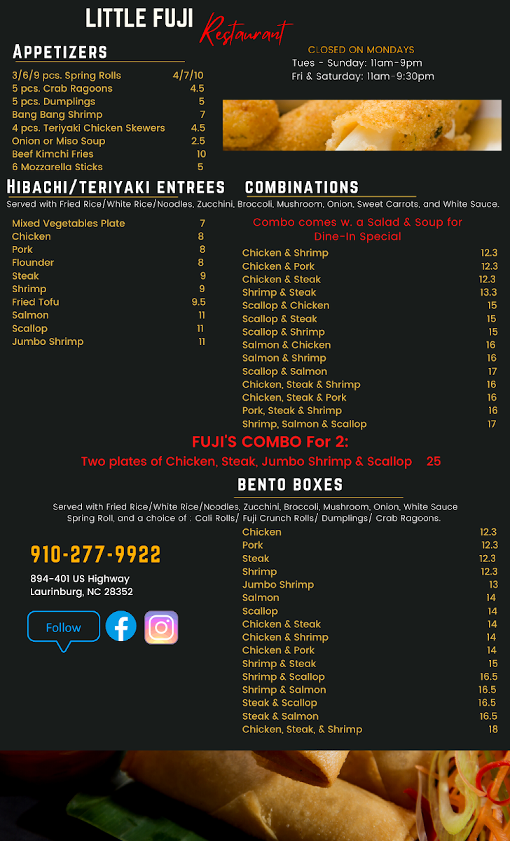 The Little Fuji Restaurant Menu offers a delightful journey through the vibrant flavors of Japan. Located at 894 US-401 in Laurinburg, NC, this cozy spot is perfect for those looking to enjoy a warm, inviting meal. Whether you're in the mood for fresh sushi, savory teriyaki, or perfectly grilled yakitori, the menu caters to a variety of tastes. Each dish is crafted with care, featuring the finest ingredients that highlight the true essence of Japanese cuisine. The combination of traditional favorites and unique creations promises something for everyone. From light appetizers to filling mains, every bite will leave you craving more.